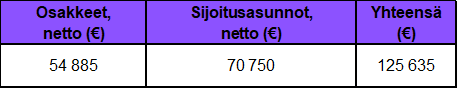 Sijoitusasuntojeni vuokratulot ja menot ovat seuraavat:
